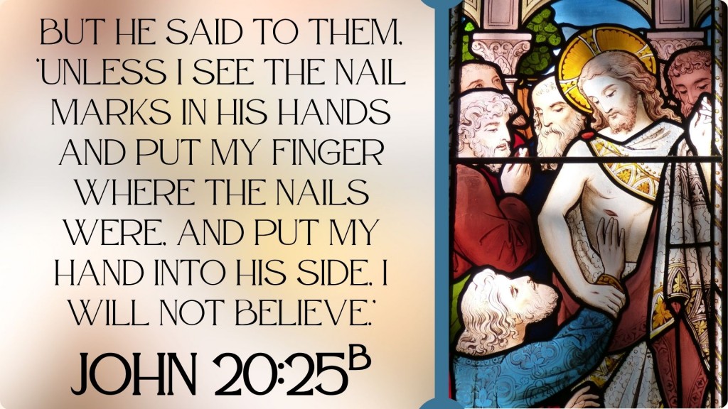 But he said to them, “Unless I see the nail marks in his hands and put my finger where the nails were, and put my hand into his side, I will not believe.”